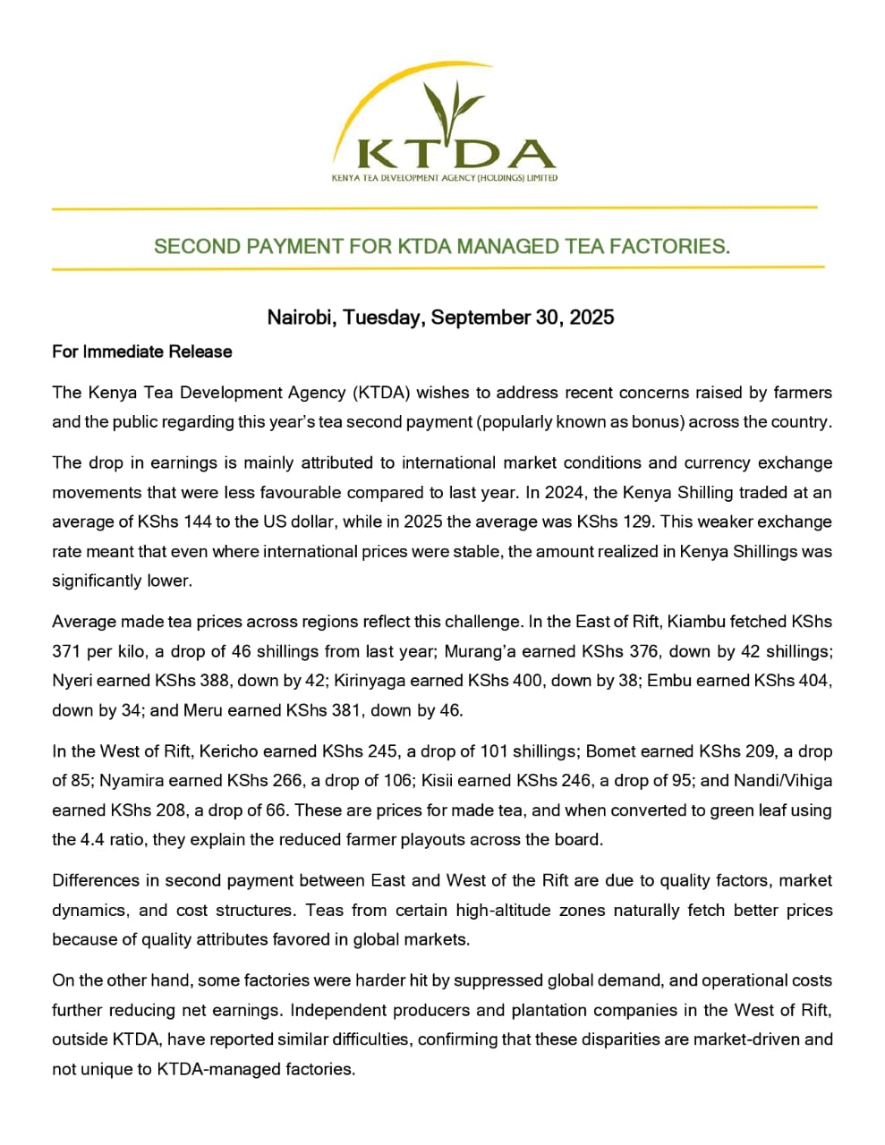 KTDA Holdings Limited KTDA STATEMENT ON FINANCIAL STABILITY AND FARMER PAYMENT. #FarmersFirst #globalleaderinquality
